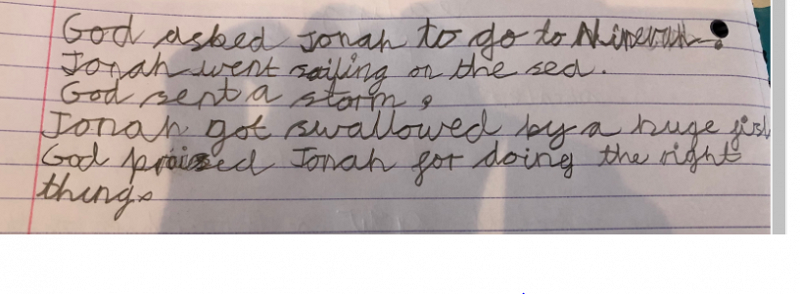 “My favourite part was when we were drawing a story map about Jonah and the Whale because we were drawing it and I like it.” Jasper, Year 2